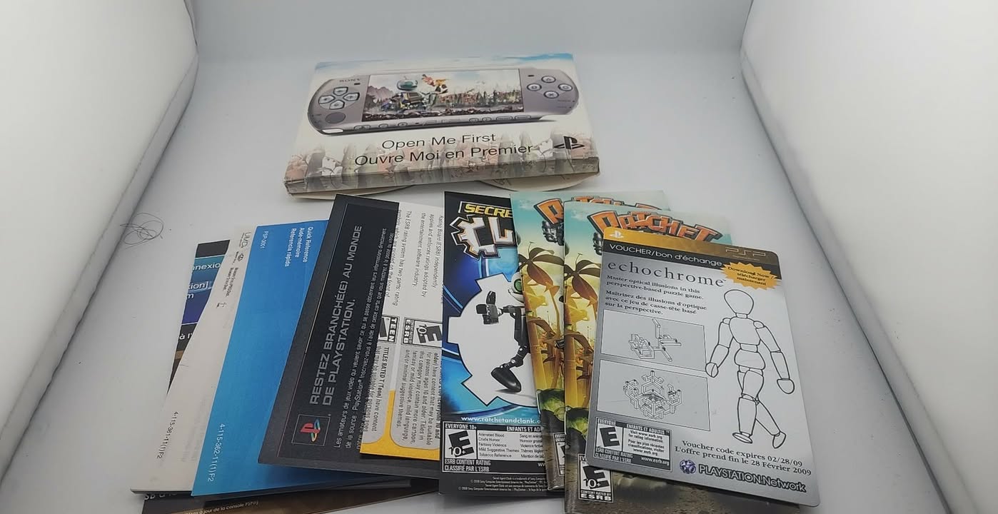 Console PlayStation Portable PSP-3000 en édition limitée Mystic Silver inspirée de Ratchet & Clank. Ce modèle spécial offre un design élégant avec écran amélioré et accès à une vaste bibliothèque de jeux PSP pour jouer partout. Une édition recherchée par les collectionneurs.